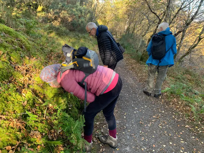 Using a hand lens is a great experience. You lift it to your eye and then bring the subject really close. At times, we would be lying almost in the banking, face inches from the undergrowth as we sought out the mosses and liverworts. And this is one of the factors that I really appreciate about this sort of work: you cannot keep your distance, you really have to get in there, and allow your senses to be filled with the woodland.