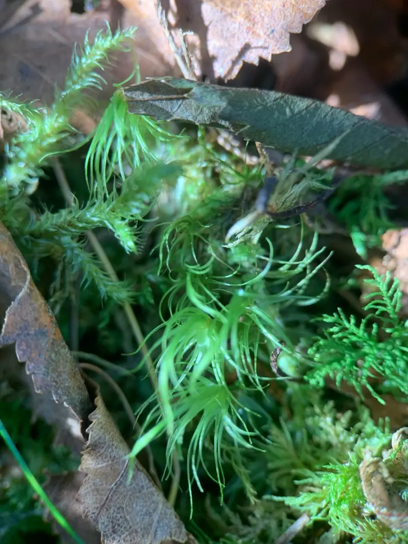 Mosses are easily overlooked, until they are not. Then you realise just what they are: they are habitats. We’ve heard about the home for the Rotifera but imagine my delight at hearing that the capsule that was half-eaten on my specimen of Hypnum andoi had probably been nibbled by a slug or snail! Then, there’s Ulota phyllantha that spreads mainly by asexual reproduction (doesn’t produce spores) and instead spreads through gemmae, part of the plant that easily splits off to be accidentally transported by small foraging birds – think treecreeper – to neighbouring trees, or by slugs and snails to different locations on the same tree.
