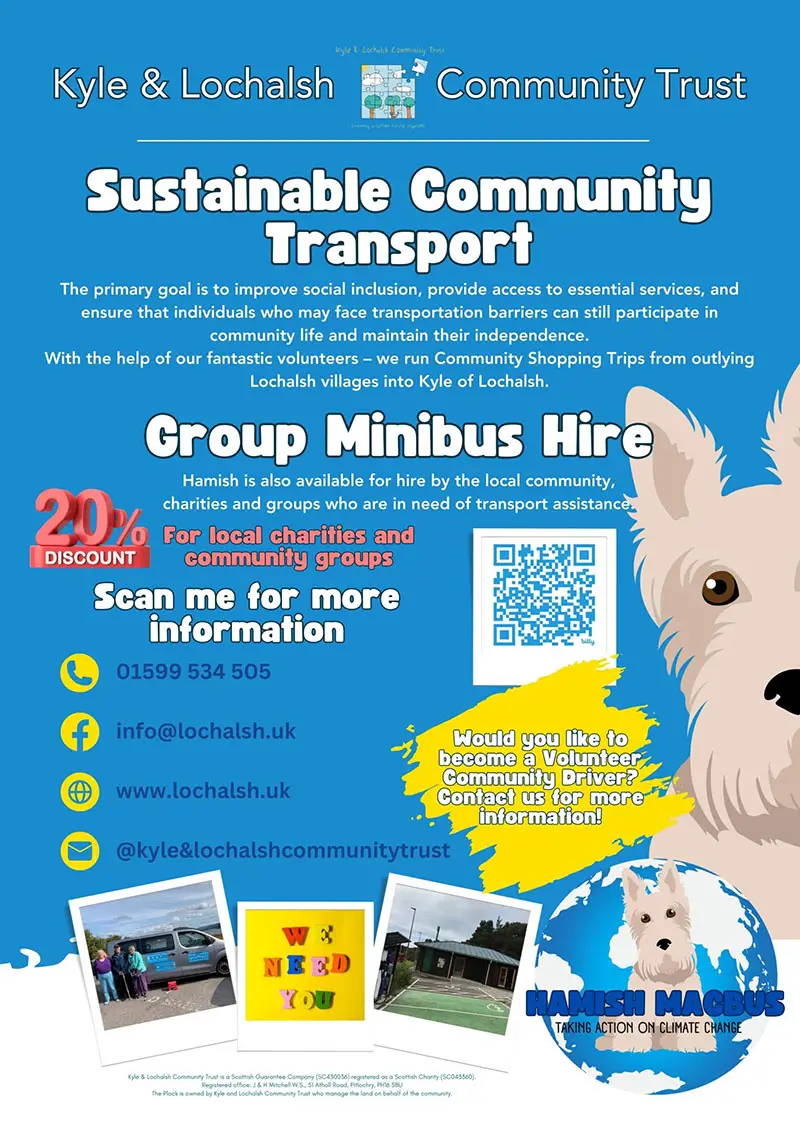 Alongside this, Hamish is also available for community hire! We are pleased to be offering a 20% discount on Hamish hire to local Lochalsh-based groups and charities. Please visit our Community Transport page for further details.