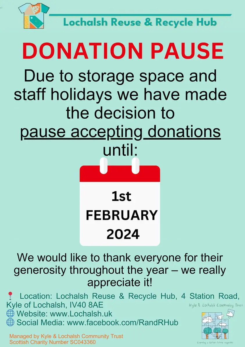 DONATIONS PAUSE AT THE LOCHALSH REUSE AND RECYCLE HUB